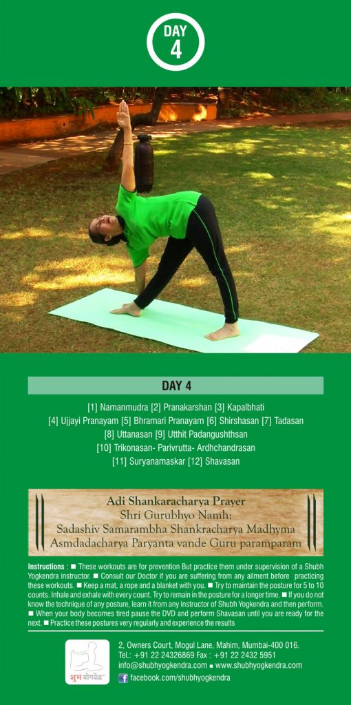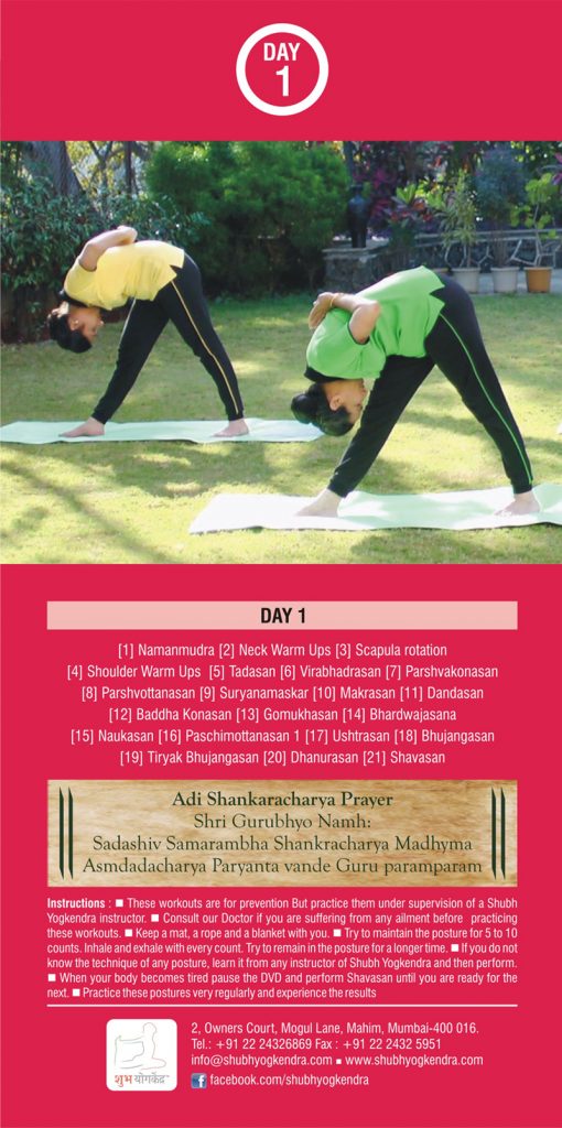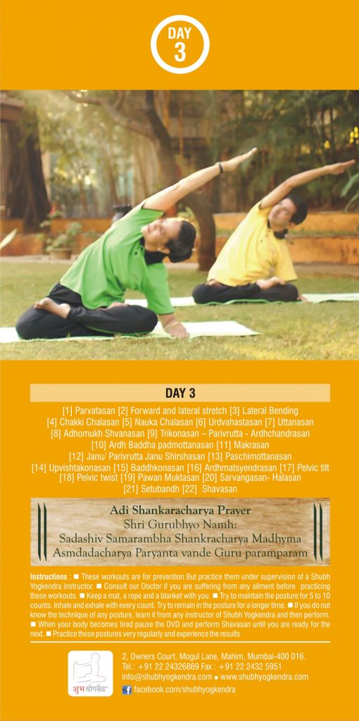 1. First Step in Yoga – This is an orientation session that is run in the Shubh Yoga Kendra and explains the principals of yoga therapy and provides introductory postures.